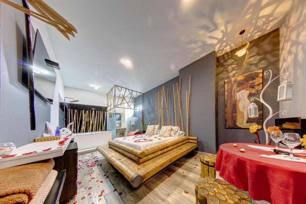 Suite with Sauna. This luxurious suite features a hot tub, a sauna and a fireplace. The suite has 1 bedroom and 1 bathroom with a bath and free toiletries. This suite features a wardrobe and a flat-screen TV with streaming services. The unit has 1 bed. ;